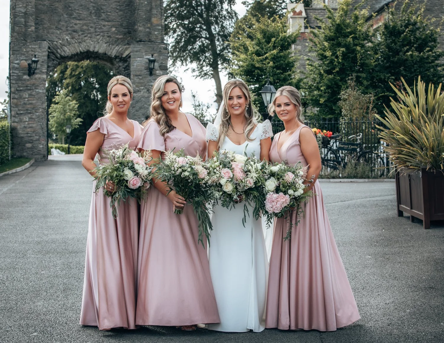 Our beautiful bridesmaid’s with our bride looking an image of perfection. The girls went for elegant dusty pink satin dresses styled with a stunning bouquet which complimented their look. The flowers were created by K McC Flowers.