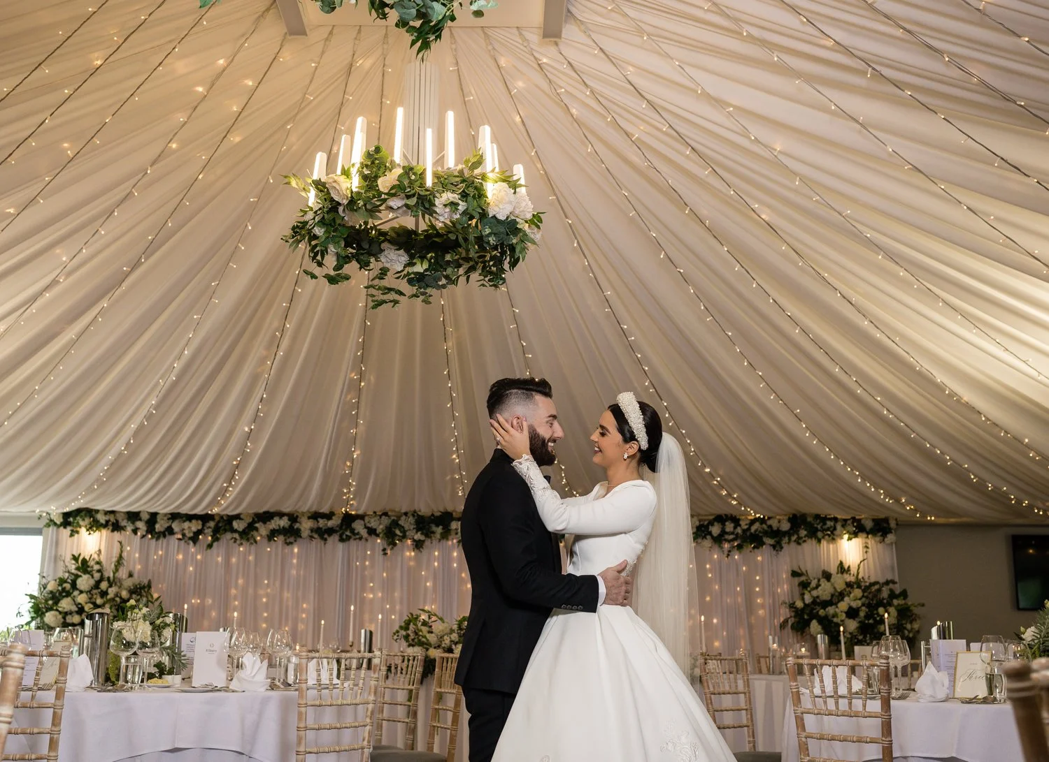 The Pavilion room within Castle Leslie provides the most jaw dropping reaction for your guests. The roof and walls are covered with drapes, fairy lights and chandaliers giving it a really magical feeling that is a perfect fit for a fairytale day. The added floral displays for an extra touch of glamour.